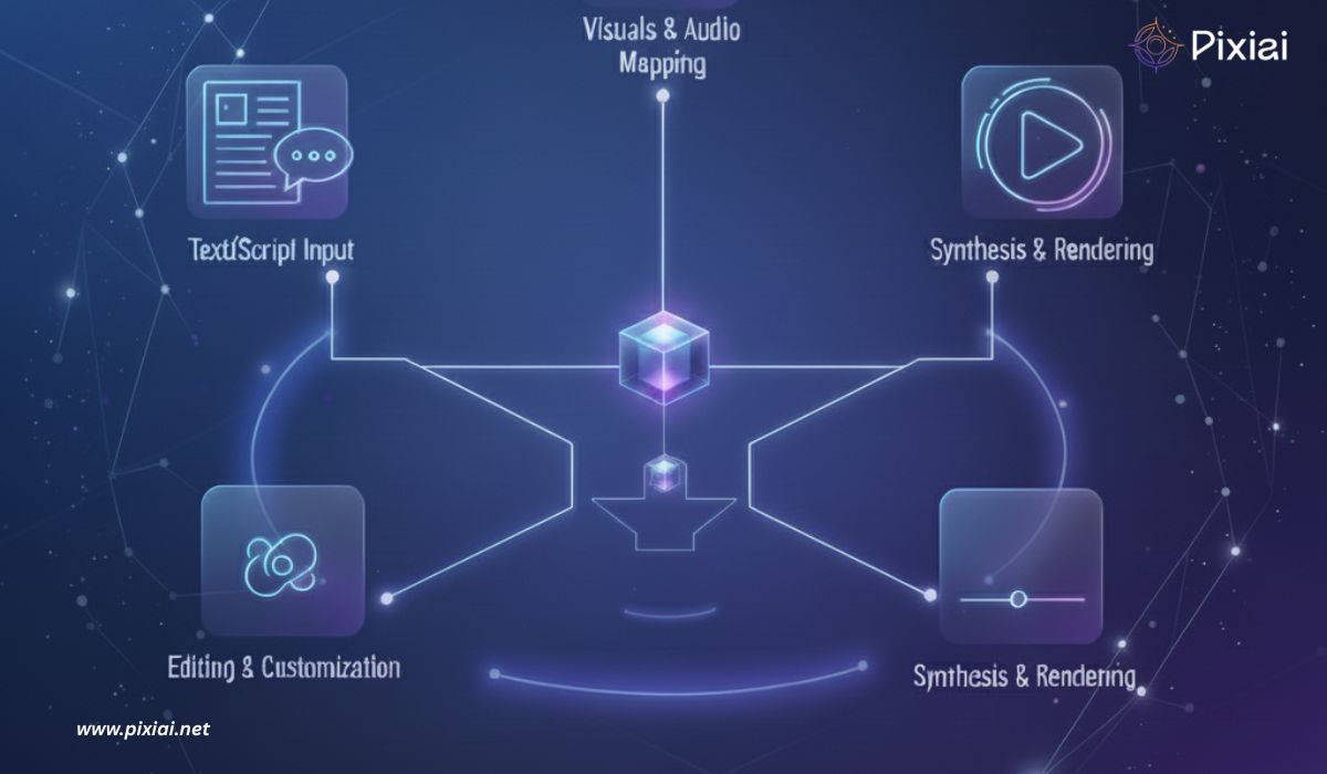 How Does an AI Video Generator Work? | Four-step process: Input script → Visual/audio mapping → Synthesis & rendering → Editing & customization. |